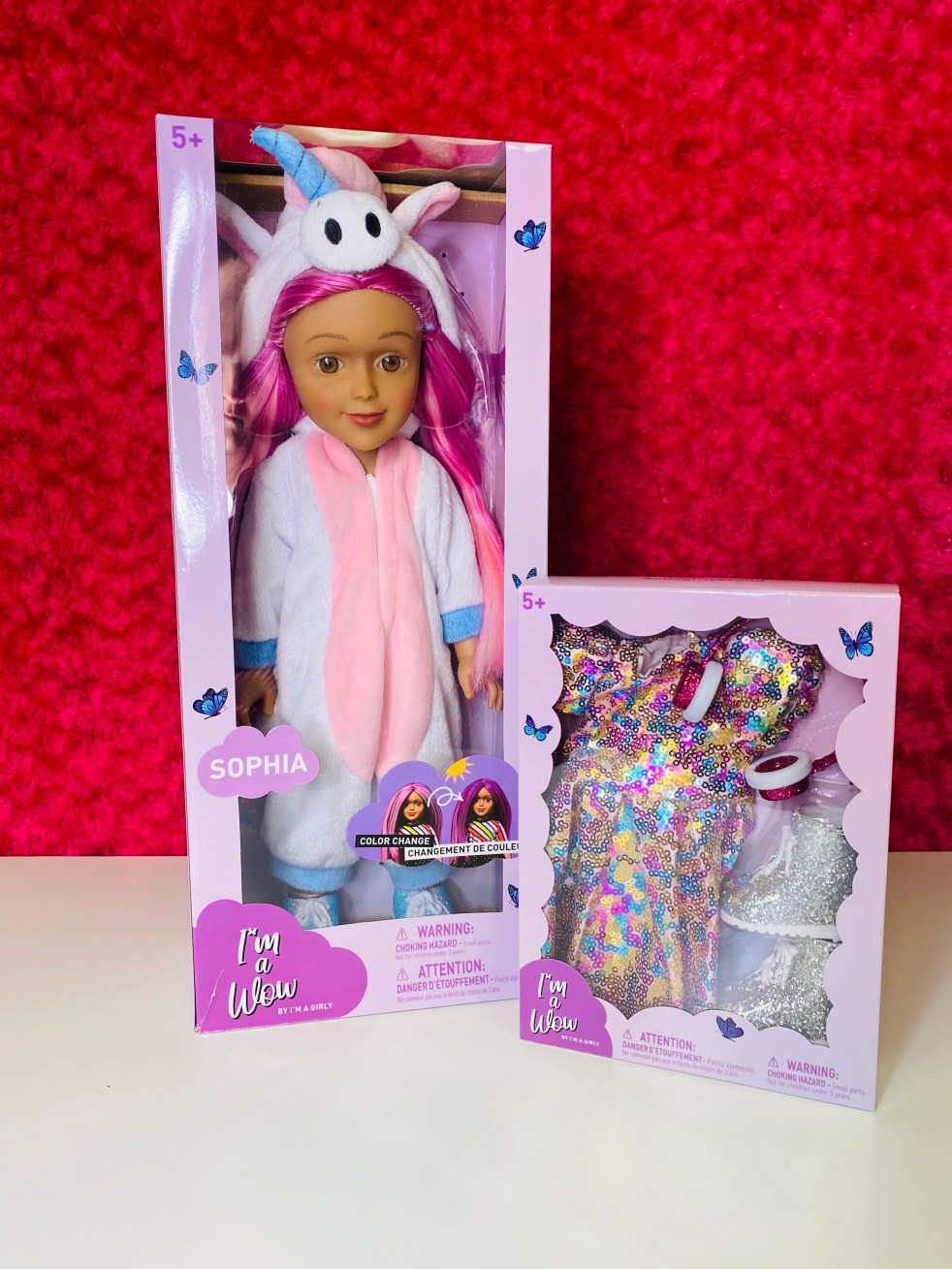I’M A WOW– Sophia- She is a true performer: she loves the big stage and the stage loves her. Whenever she gets the chance, she entertains her friends with a little dance or song. Her kind, hazelnut brown eyes and hot pink hair are unmistakably and truly Sophia. She feels all fuzzy and comfortable in her cute and trendy unicorn pajama and her blue glitter shoes. She is 36 cm (approx. 14 inches) tall.